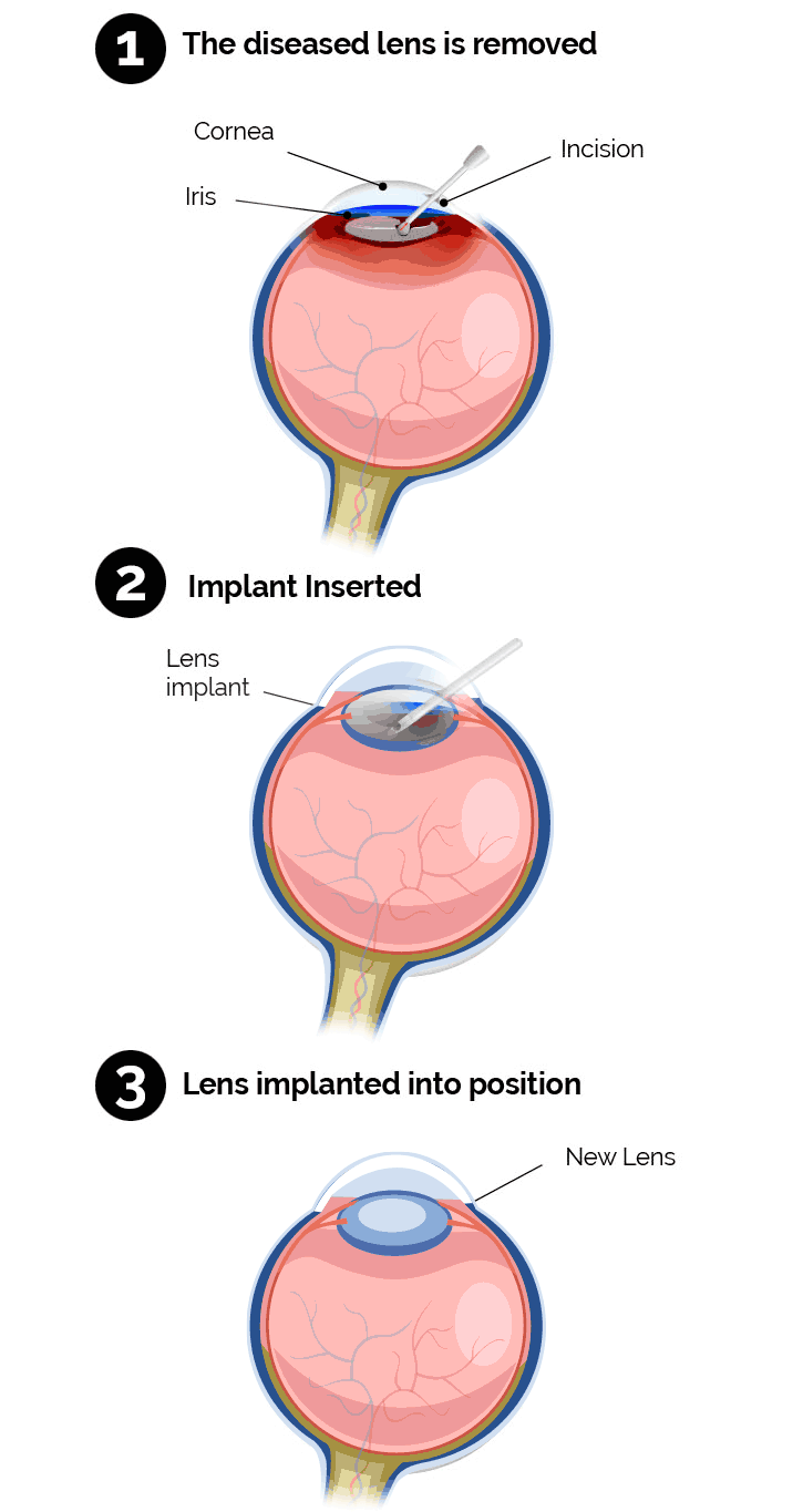 - The eye doctor will place drops into your eyes to numb them and dilate your pupils. Though you’ll be conscious during the procedure, you may be offered a sedative to help you remain calm. The eye surgeon will then remove your natural lens and replace it with the IOL. You should feel no pain or discomfort thanks to the anesthetic.